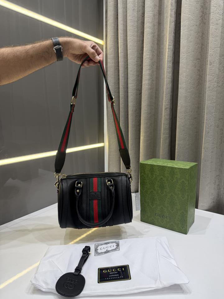 • GUCC.I TAN BLACK LEATHER BOSTON BAG PREMIUM WITH OG BOX PACKING